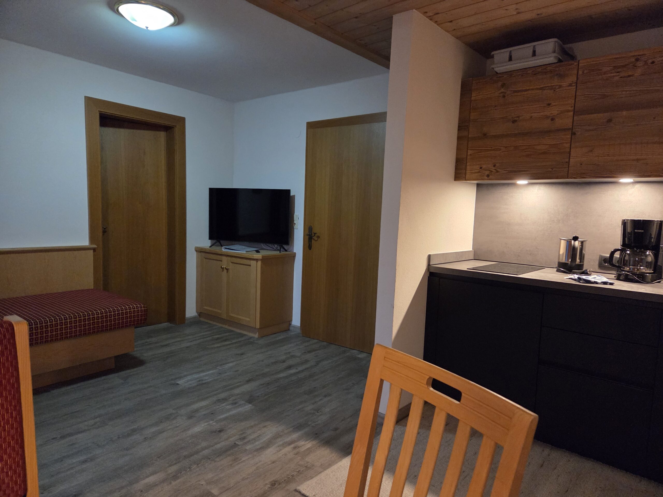Ausstattung: Große Küche mit Sitzecke 3 Schlafzimmer mit TV (Dreibett, Doppel und Einzelzimmer) WC und Bad Dusche WC getrennt, großes Zirbenwohnzimmer mit Sitzecke und Couch. Balkon und Terrasse. inclusive Halbpension.
